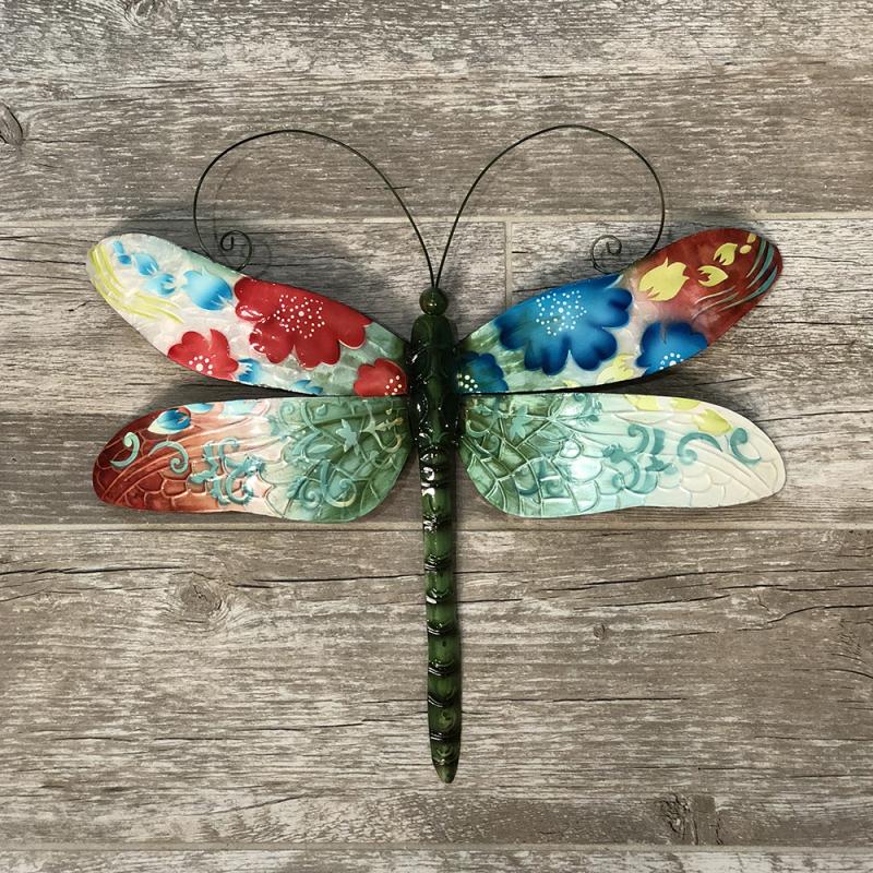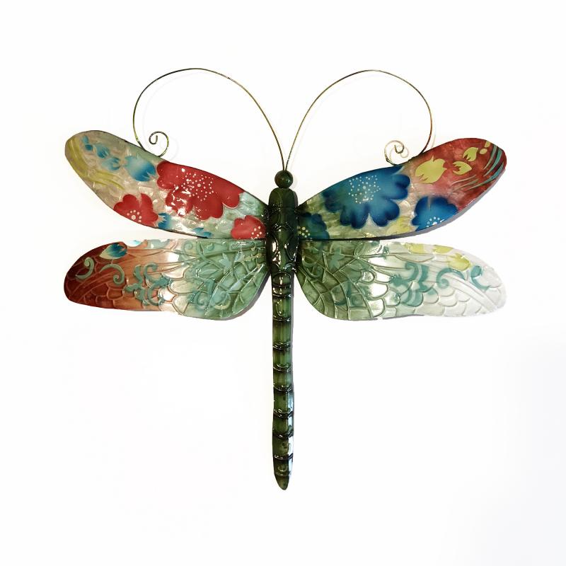 With colorful rising flowers, this dragonfly represents spring rising to overtake winter's cold. The bold tones will provide a strong accent to any space. A mix of color and designs painted on the wings add depth and dimension.